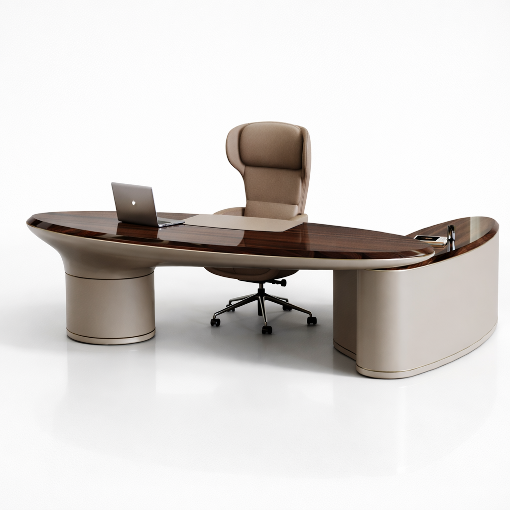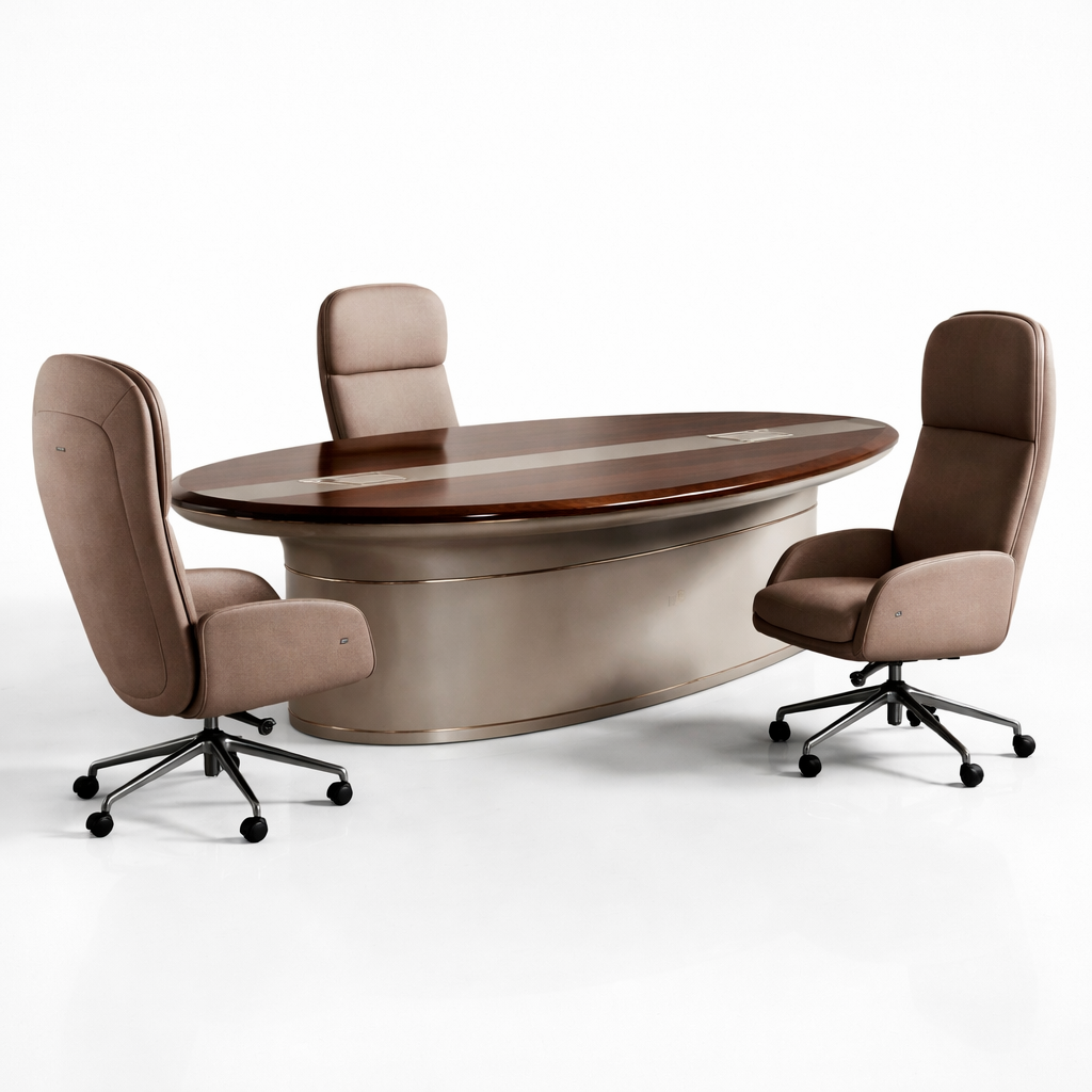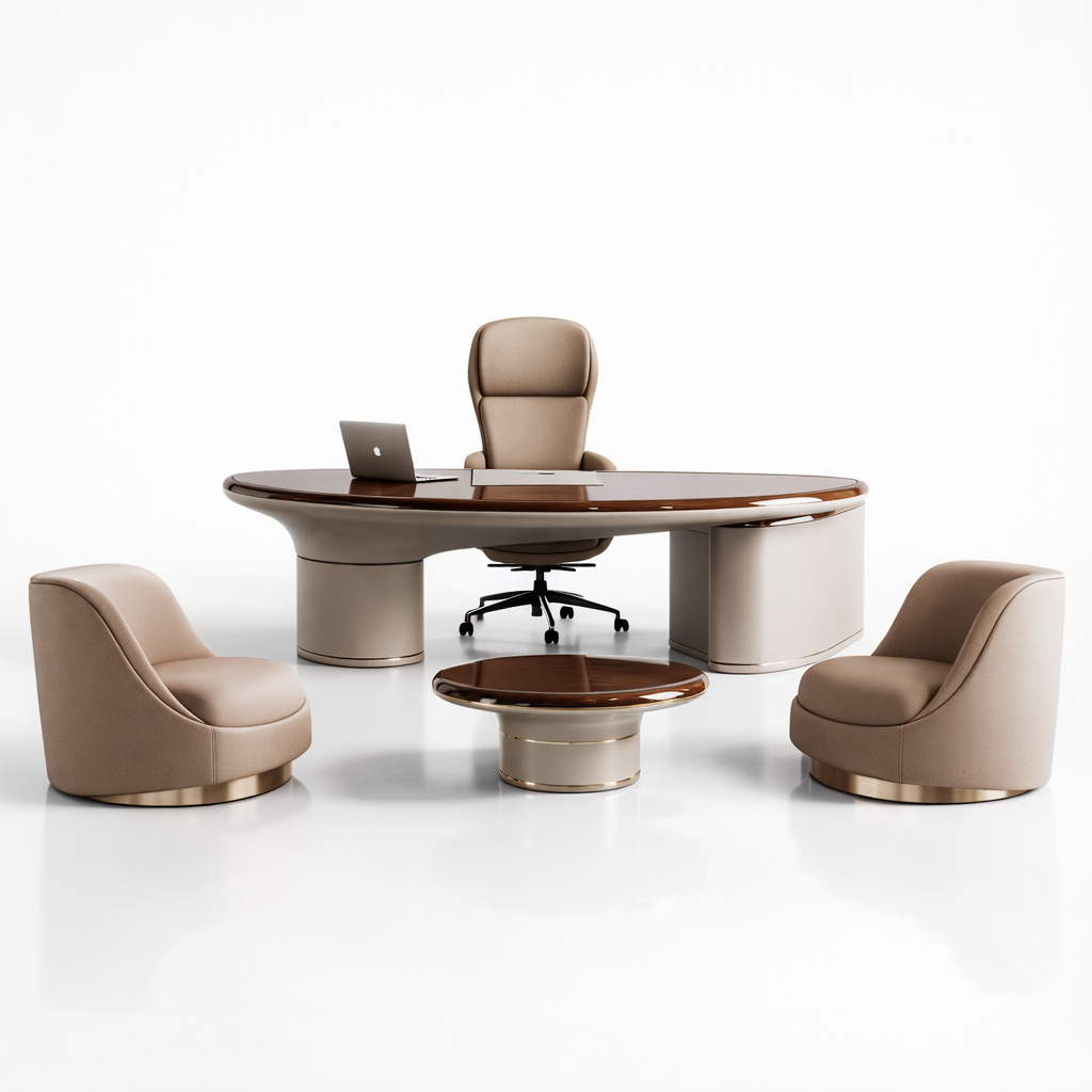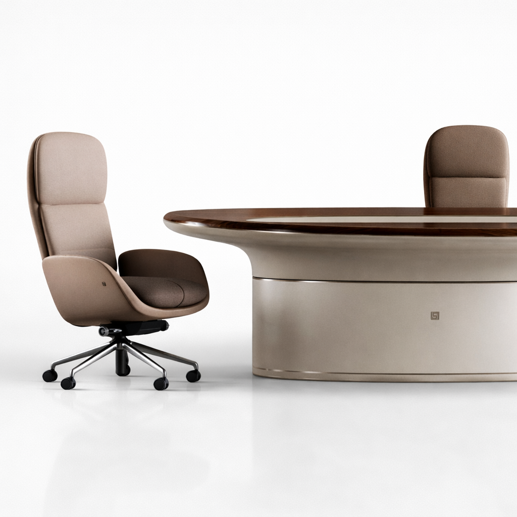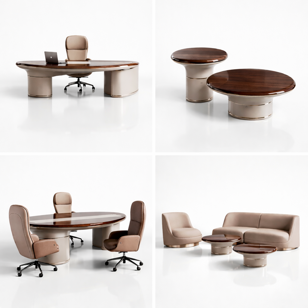 Fongos Ofis Takımı, güçlü form dili ve akıcı hatlarıyla üst segment yönetici ofisleri için tasarlanmış özel bir koleksiyondur. Oval formdaki geniş masa yapısı ve dengeli kütle dağılımı, mekâna hem modern hem de otoriter bir karakter kazandırır.