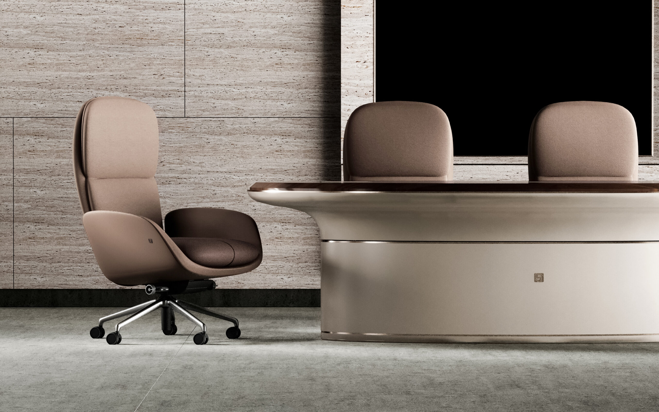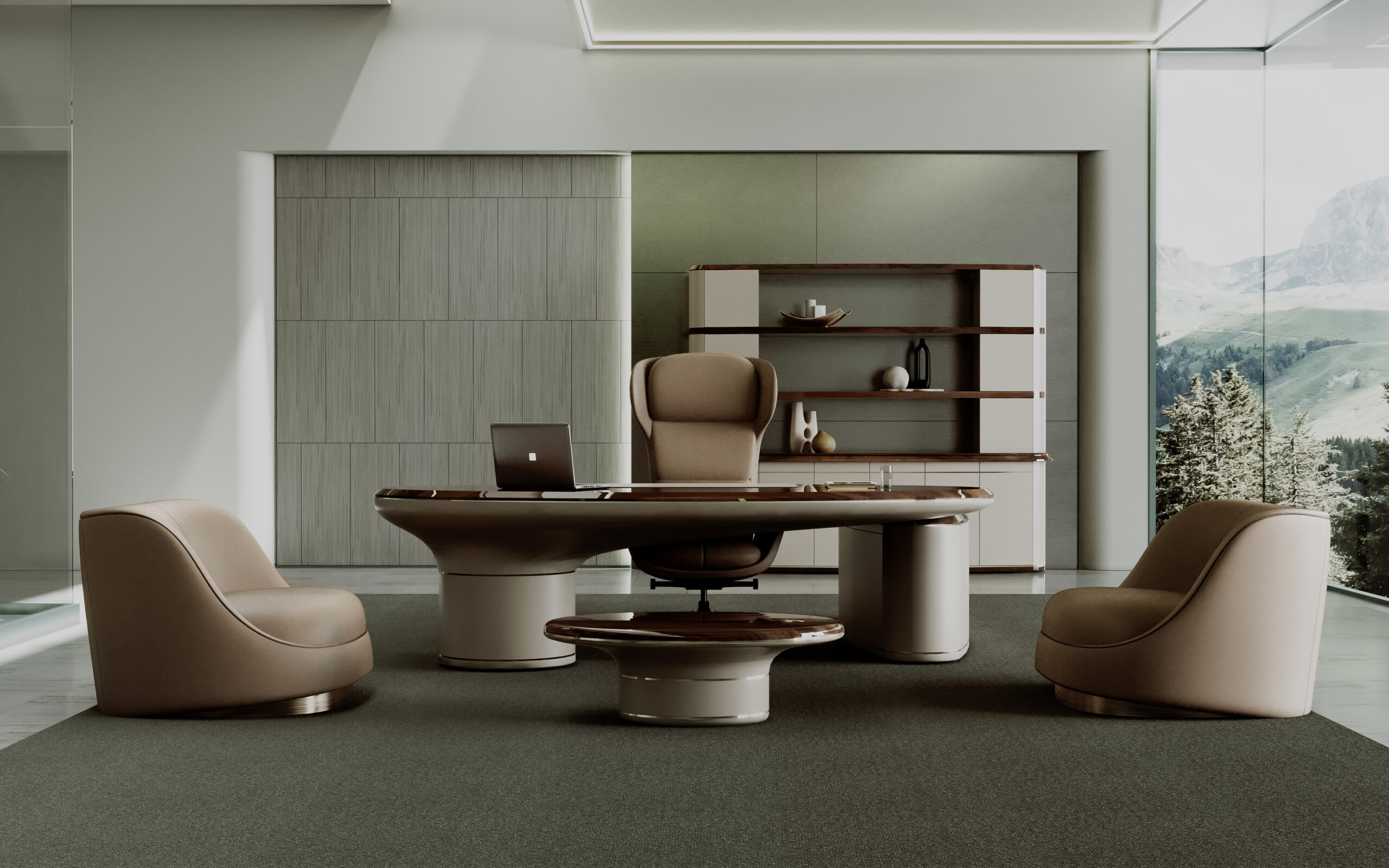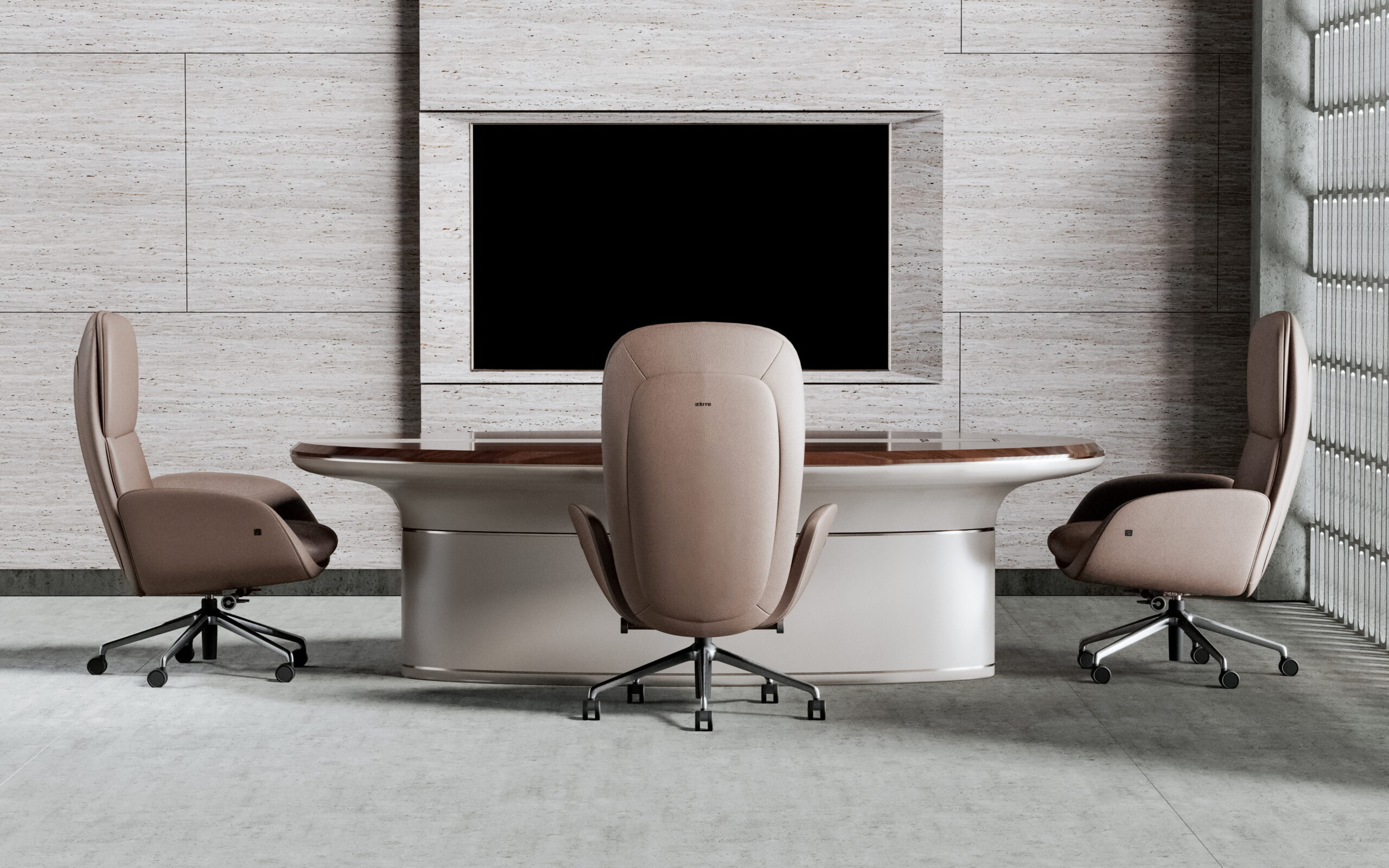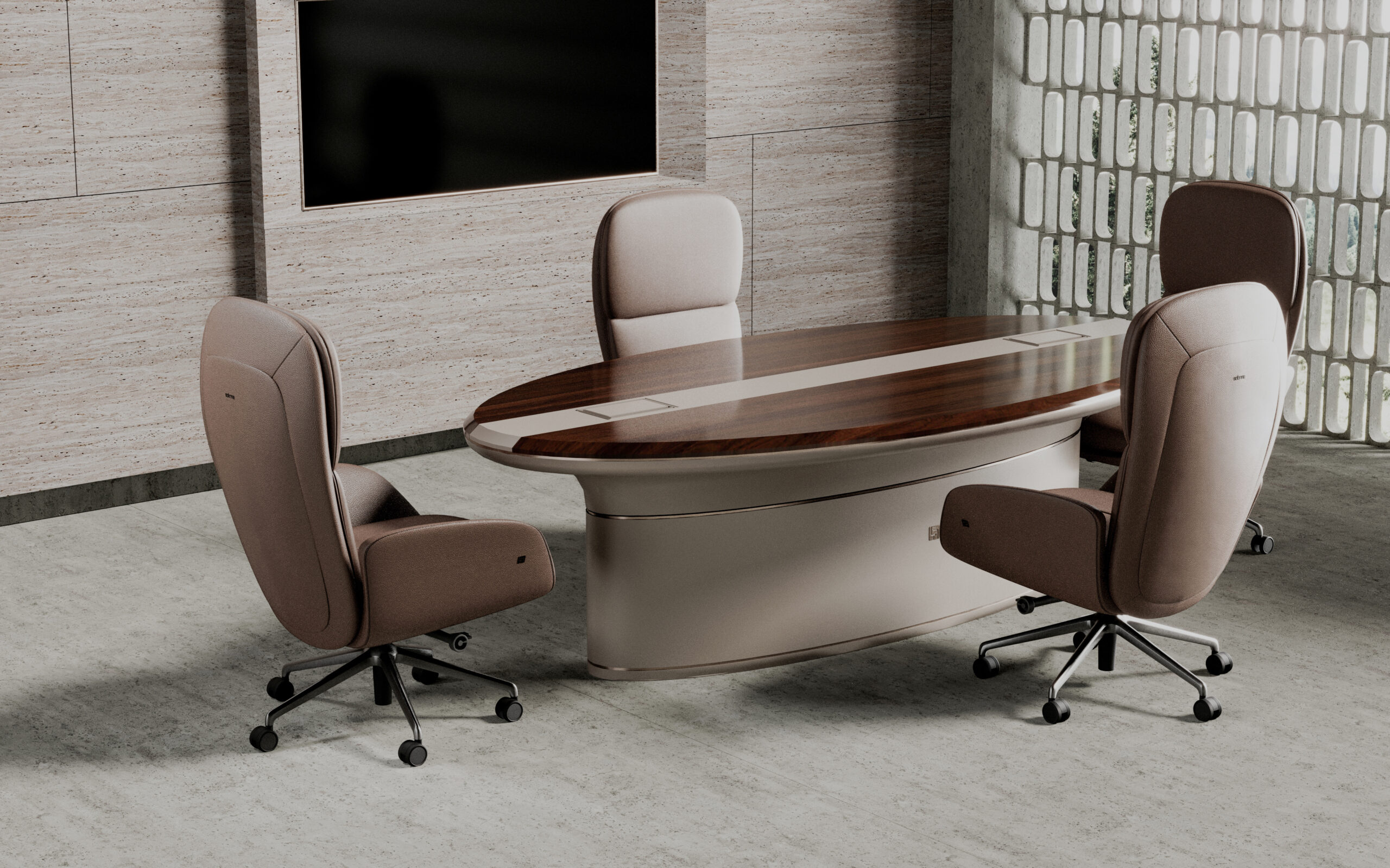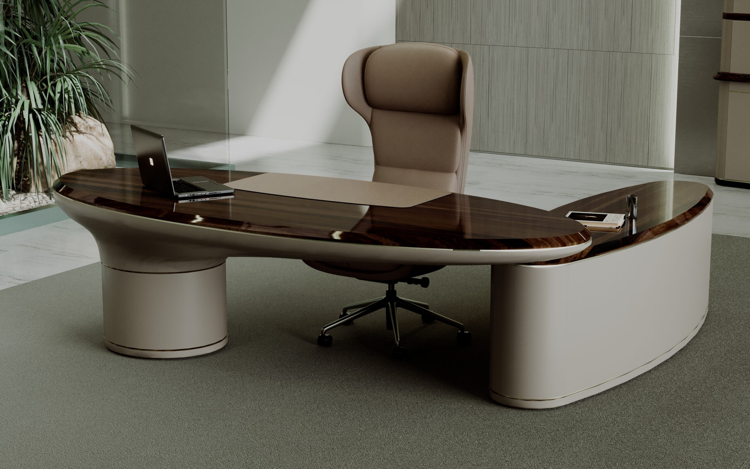 Fongos Ofis Takımı, güçlü form dili ve akıcı hatlarıyla üst segment yönetici ofisleri için tasarlanmış özel bir koleksiyondur. Oval formdaki geniş masa yapısı ve dengeli kütle dağılımı, mekâna hem modern hem de otoriter bir karakter kazandırır.