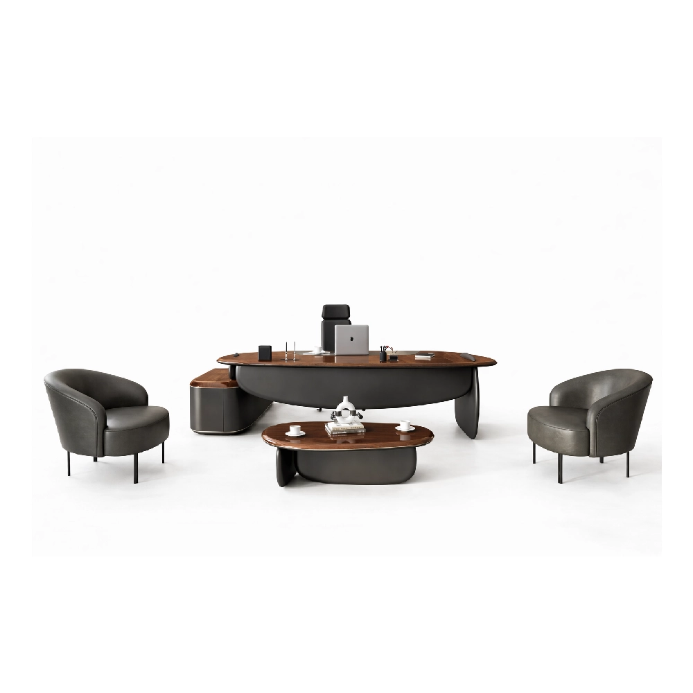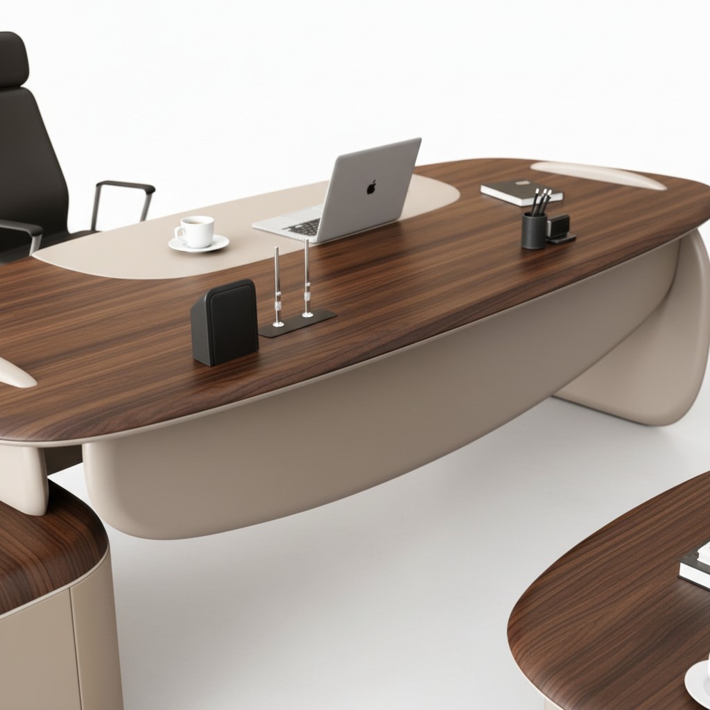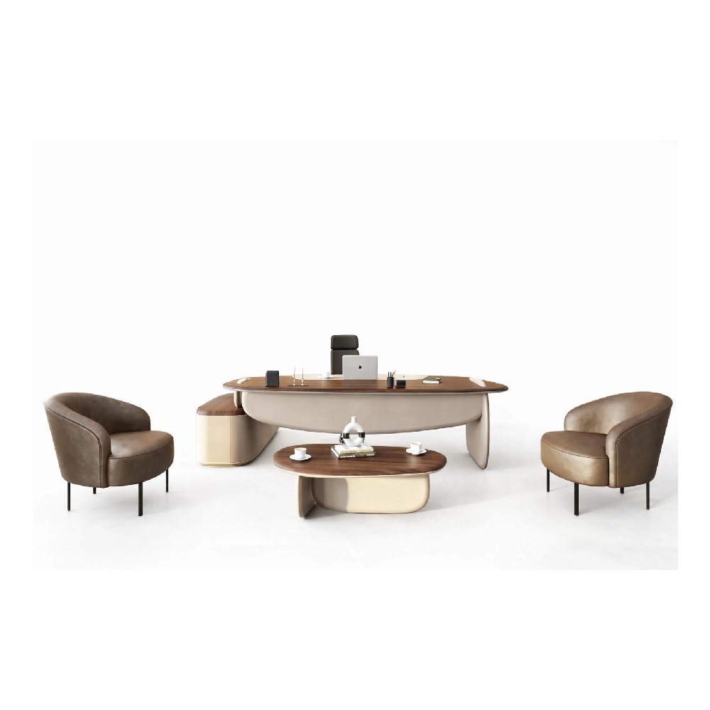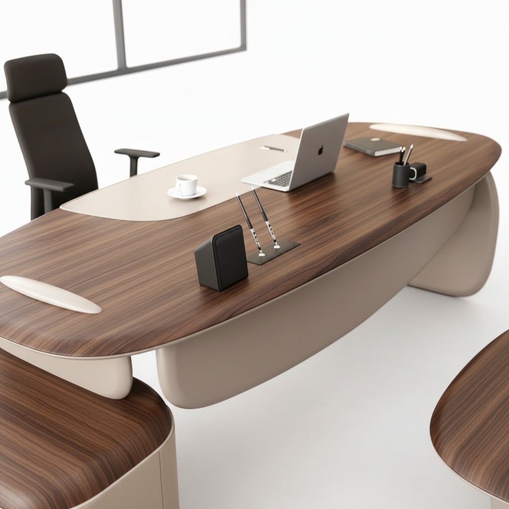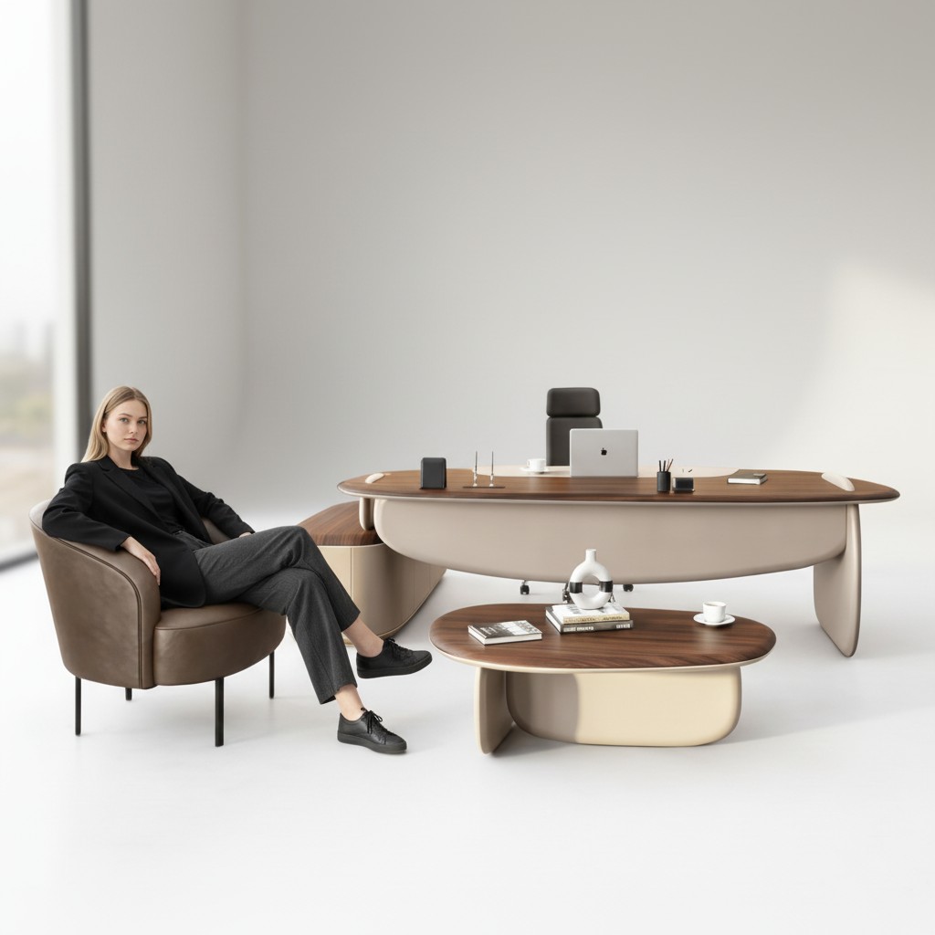 STONE Yönetici Ofis Takımı, sade ama güçlü tasarım diliyle modern ofisler için zarif ve dengeli bir çözüm sunar. Yumuşak geçişli oval hatlara sahip masa formu, mekâna akıcılık kazandırırken doğal renk tonlarıyla sıcak ve davetkâr bir atmosfer oluşturur.